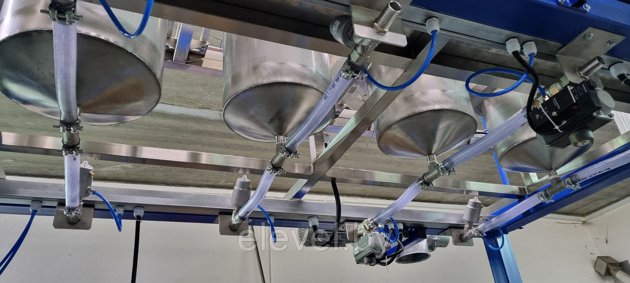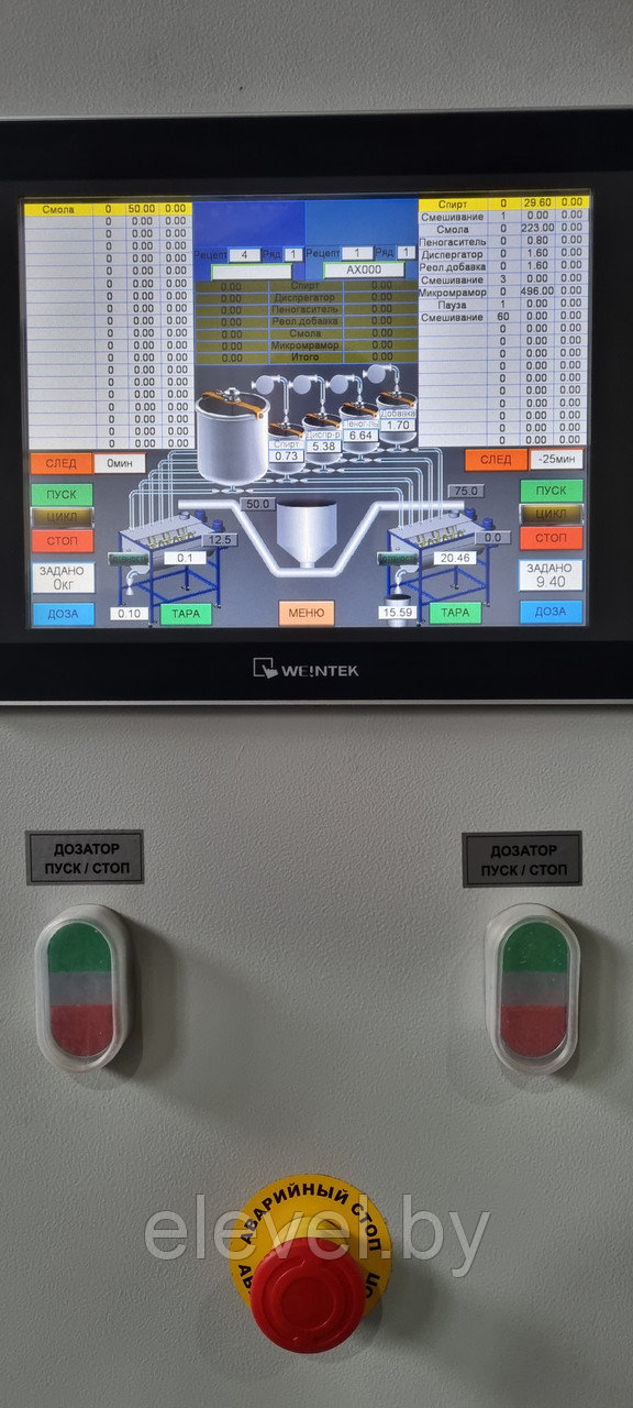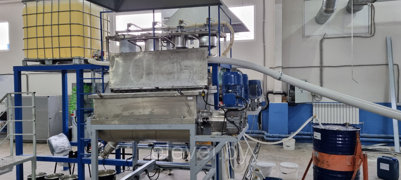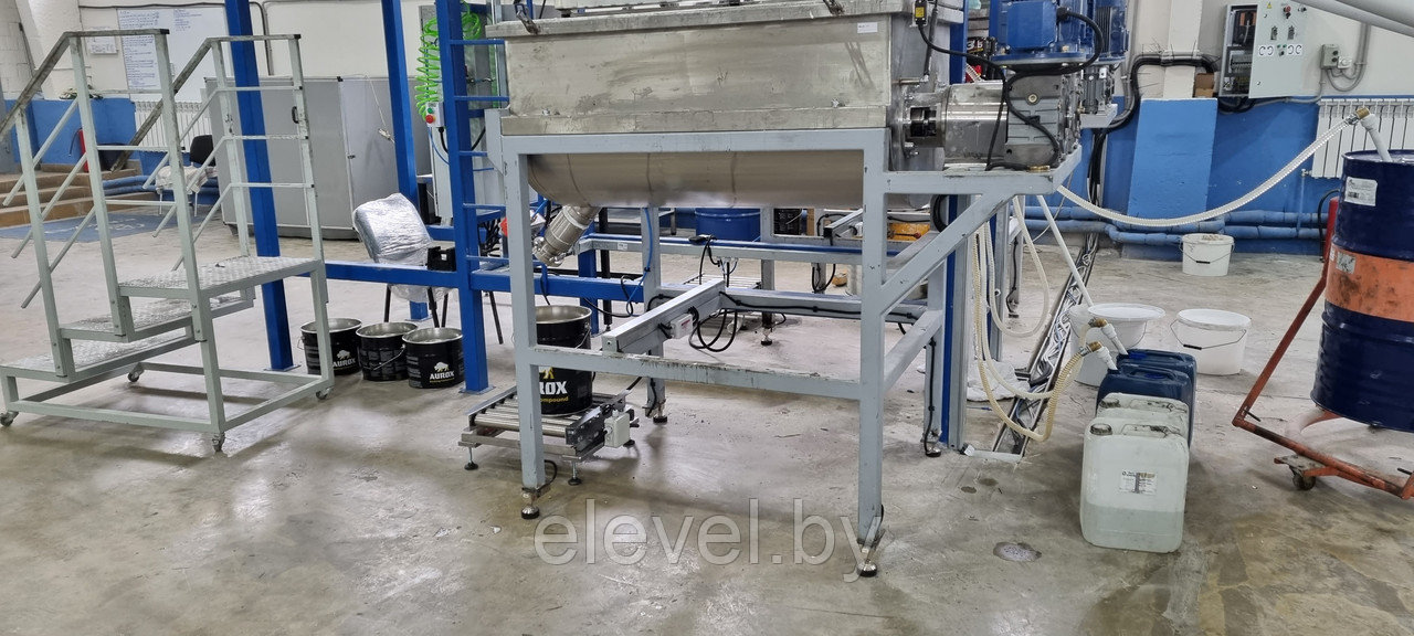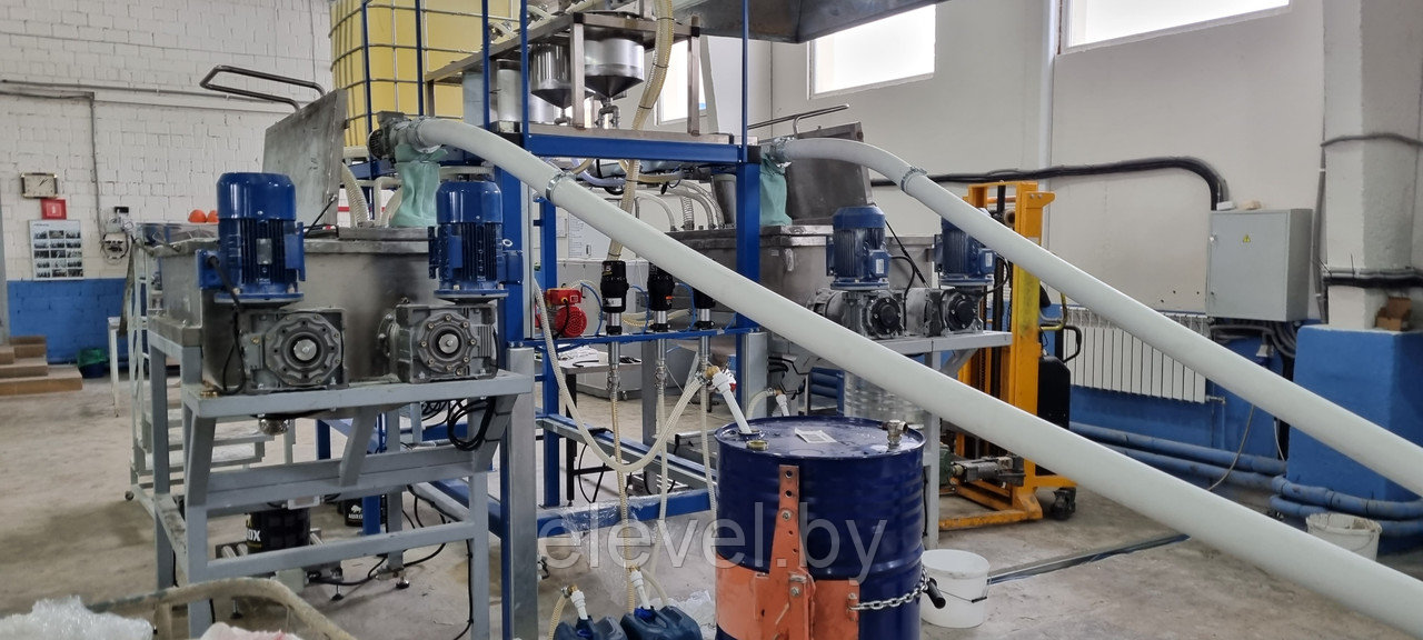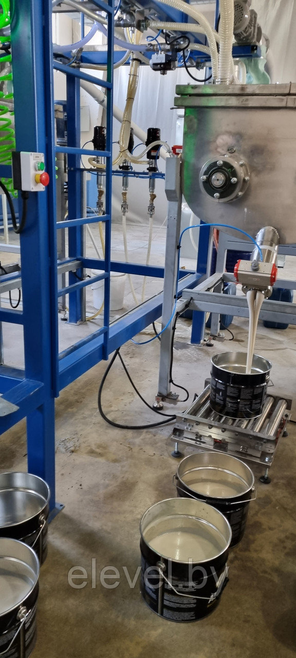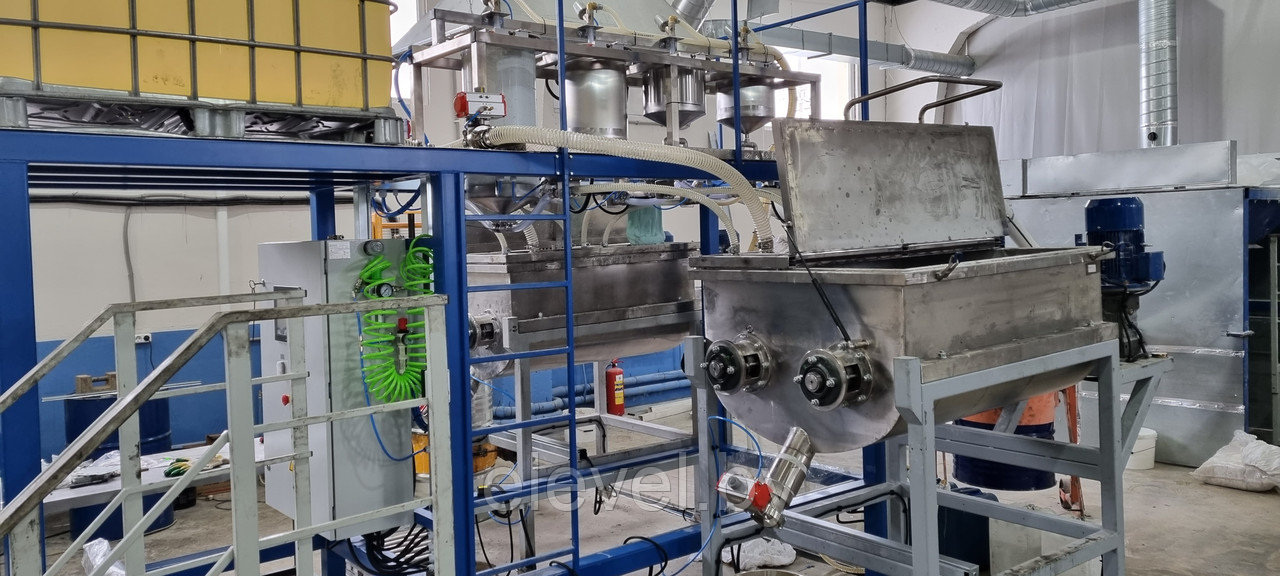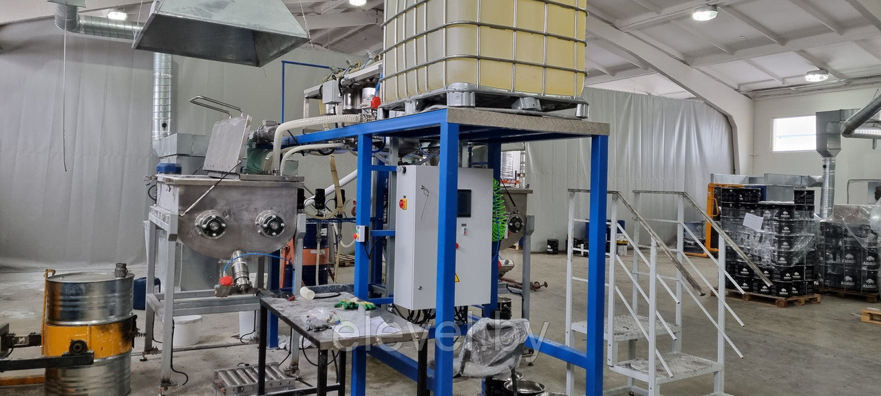 Установка приготовления и розлива эпоксидного компаунда ДЭА-500-СЖ-7 предназначена для последовательного дозирования 2-х (двух) сухих компонентов (микромрамор) из растаривателя при помощи 4(четырех) гибких шнековых транспортера, 4 (четырех) жидких компонентов (бензиловый спирт, диспергатор, пеногаситель, реологическая добавка), а так же Смолы из еврокуба в смесители №1 и №2, установленные на тензодатчики. Установка так же производит розлив готового компаунда в ведра, установленные на весовые роликовые столы.
